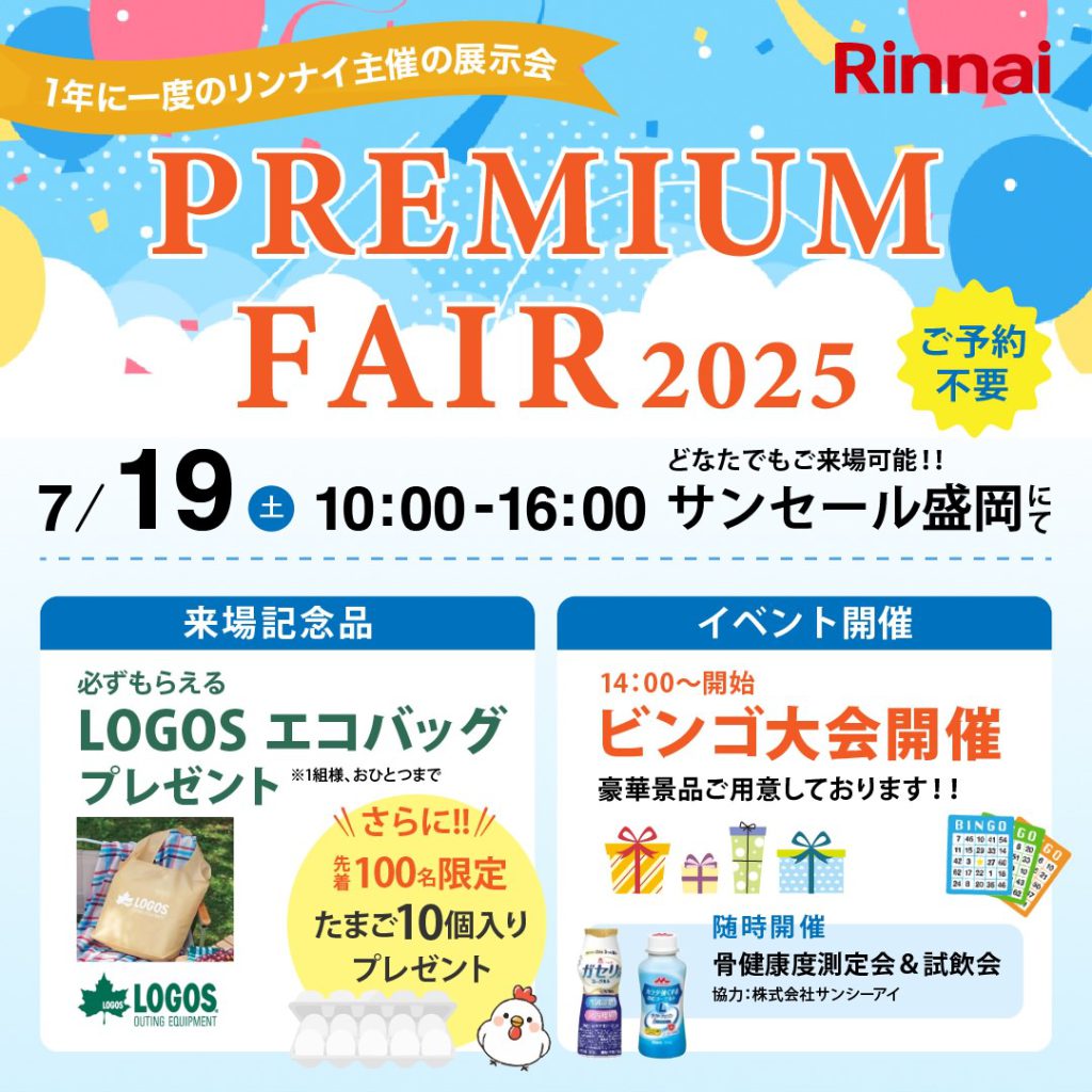 【リンナイ PREMIUM FAIR 2025】 日時:7月19日(土) 10:00~16:00 場所:サンセール盛岡 (入場無料・予約不要)